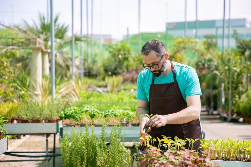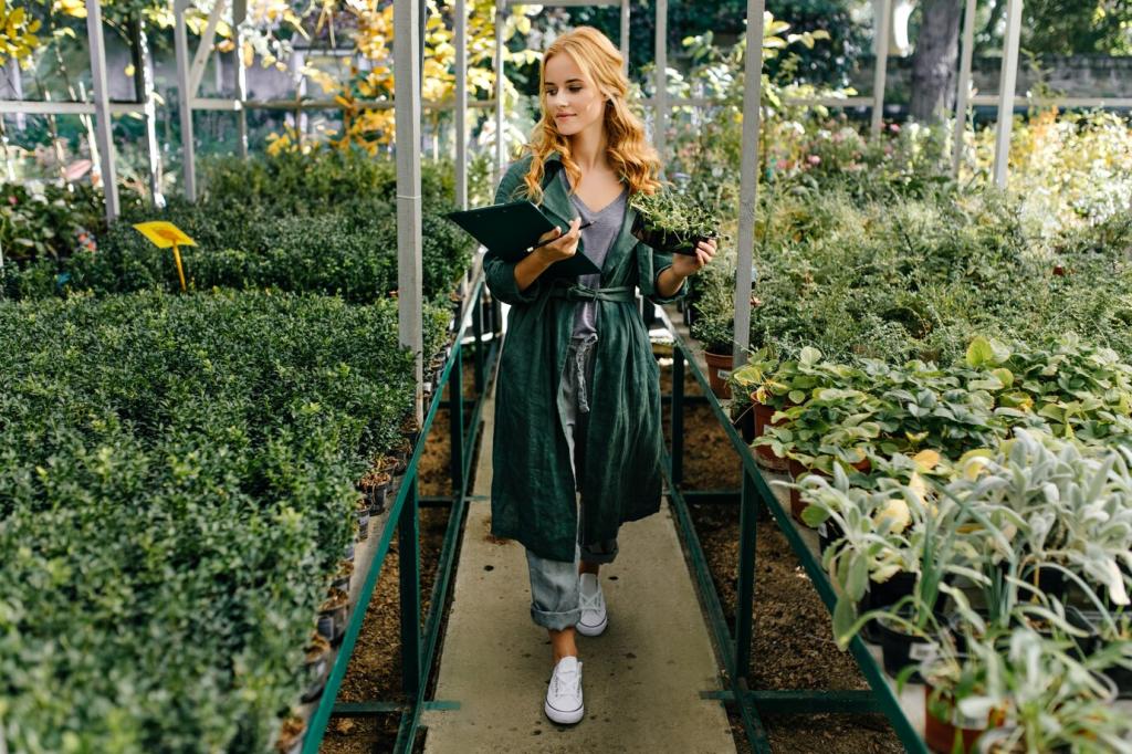 Grow intentional edibles: a single dwarf tomato in a clean cylinder, a uniform stripe of basil, or rotating trays of microgreens. Keep varieties few and flavors bold. Share your simplest edible lineup and your best two-ingredient harvest recipe.